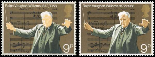 1972 9p Vaughan Williams mint unmounted o.g. with ‘BROWN (FACIAL FEATURES) OMITTED’. A scarce missing colour, with normal for comparison. SG 903b