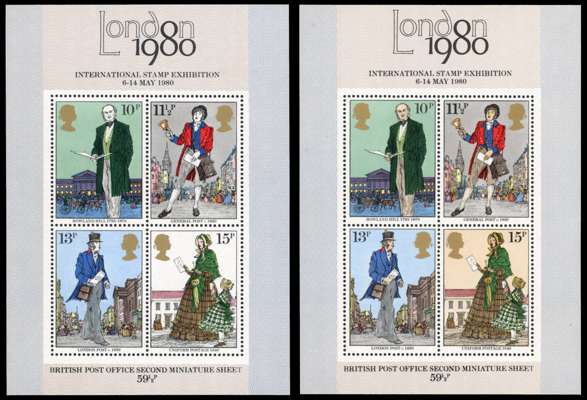 1979 Rowland Hill miniature sheet with brown-ochre omitted, mint, unmounted o.g. Offered with normal for comparison. Scarce, Pierron records only 6 mint examples. SG MS1099b cat £3,750.