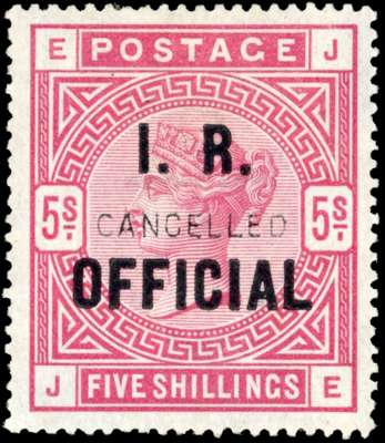 I.R. OFFICIAL. 1890 5s rose (JE) overprinted CANCELLED (type 14), mint with large part o.g. Lovely fresh colour. A rare stamp. SG O9 var, Spec L7(2)u
