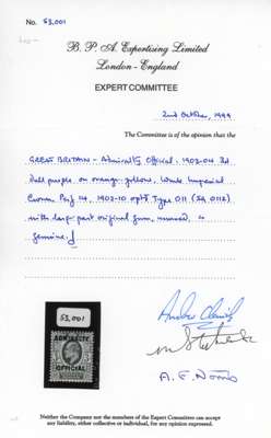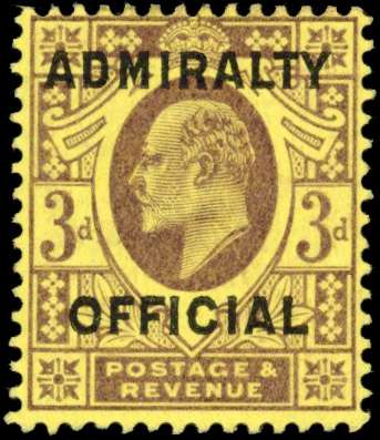 Admiralty OFFICIAL.1903 3d dull purple on orange-yellow paper. Very fine and fresh mint, large part o.g. example of this very difficult departmental issue. BPA Certificate (1999). SG O112 cat £2,600.