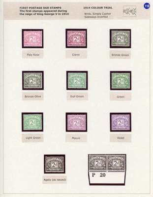 Postage Dues. 1914 2d colour trials (9) selection neatly arranged on an album page comprising pale rose, claret, bronze-green, bronze-olive, dull green, green, light green, mauve and violet; all large part og. Also three issued stamps. Generally good to fine. (12). SG D4 var
