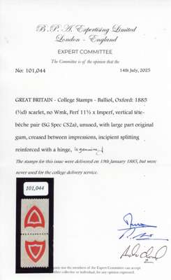 BALLIOL COLLEGE, OXFORD: 1885 (½d) scarlet, perf 11½x imperf tête-bêche vertical pair, mint large part o.g., minor central perf splitting (sensibly reinforced by hinge) and odd minor tones, otherwise fine, a rare pair. BPA Certificate (2024) CS2 cat £950