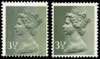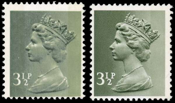 GB: 1971-96 3½p deep olive-brown, FCP/PVAD, faulty ink mix and 3½p deep olive-green, OCP/PVAD, error, both mint