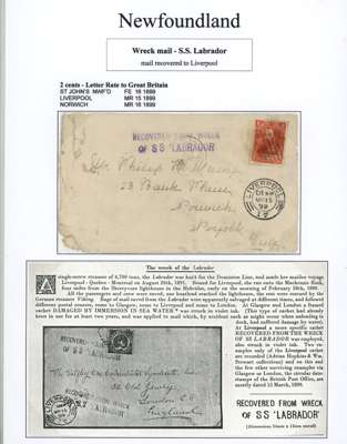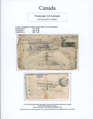 POSTAL HISTORY: 1899 collection of four covers and one wrapper all salvaged from the wreck of ‘’S.S. Labrador'', which hit Mackenzie Rock of the Hebrides in thick fog, including: Canada 1ct green postcard with boxed ‘Damaged by Immersion in Sea Water’ h/s, post office sealing tape with impression of adhesive, marked in m/s ‘Saved from the wreck of Labrador’, cover franked by Canada 2ct Imperial Penny Postage, cover to London with stamps floated off and cover to Norfolk, franked by 1897 2ct King Edward with two lined ‘Recovered From Wreak of SS Labrador’ h/s, an interesting and scarce group.