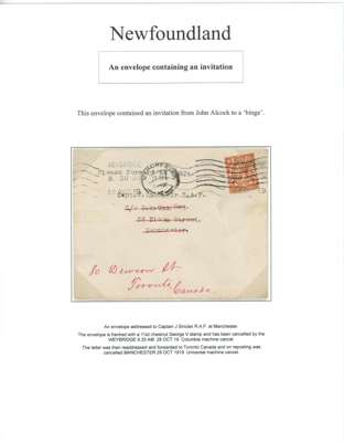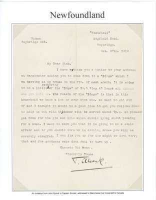 1919 (27th Oct) typed letter addressed to Capt. J. Sinclair, signed by J.Alcock, one of the pilots of the First Non-Stop Transatlantic Flight inviting him to a ‘Binge’ ‘’The reason of the ‘’Binge'' is that in this household we have a lot of sour wine…'' offered with original cover, a very scarce item and ideal for exhibiting. Alcock ends the letter ‘’ I can fix you up for the night so don't worry that and for goodness sake don't fail to turn up. Cheerio old Bean.''