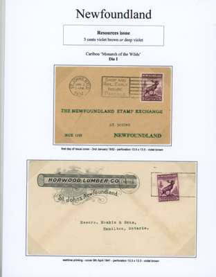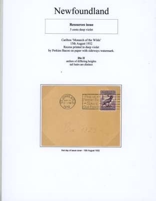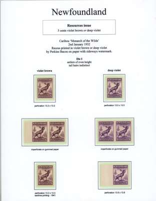 1932 Resources 4ct, 5ct, 6ct & 7ct mint and used collection on exhibition pages, including: 4ct plate proof pair in black, 4ct carmine imperf pair and imperf horiz between vertical pair, 5ct Caribou Die I, shades in mauve and violet-brown, with imperf pairs, Die II with imperf singles and block of four, with some covers, 6ct imperf pair and 7ct imperf pair, generally fair to fine condition. SG 212-226
