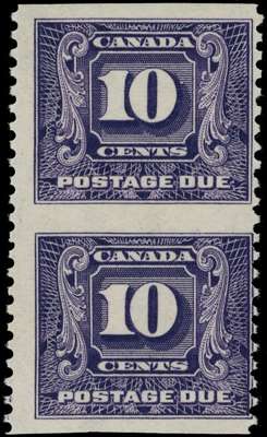 CANADA: 1932 10c bright violet postage due, vertical pair imperf x perf, fine o.g. SG D13var...