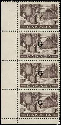 Officials. 1950 10c brown-purple vertical corner strip of four, R7/1 overprint omitted, unmounted o.g. A fine positional piece. SG O191a, £950