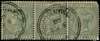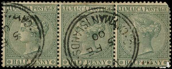 Jamaica used in. 1898-1901 ½d green horizontal strip of three with two part strikes of Type Z3 Grand Cayman CDS, 5 FE 00. Right-hand stamp with rounded corner. SG Z10
