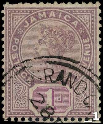 Jamaica used in. 1898-1901 1d purple and mauve with part Type 3 CDS of GRAND CA(YMAN), a couple of short perfs at top. SG Z11, £600