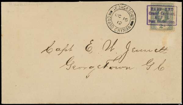 1912 cover to Georgetown bearing 2d grey with the boxed violet EAST END Rural cancel, Georgetown arrival OC 16 12 alongside. Boddentown transits on reverse. Light staining. SG 43