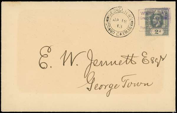 1913 cream envelope to Georgetown bearing 2d grey with the violet boxed WEST BAY Rural Post cancel, Georgetown arrival of JA 18 13 alongside. An unusually neat and clean cover with the rarest of the Rural Post markings