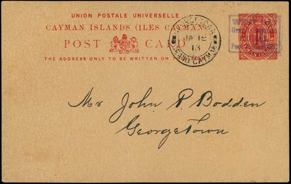 Postal Stationery. 1913 1d postcard to John Bodden in Georgetown, fine boxed violet West Bay Rural Post cancel and Georgetown arrival JA 18 alongside. Unusual on a postcard and with commercial message on reverse
