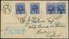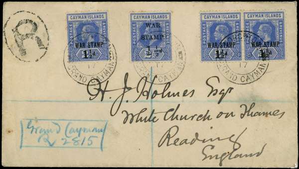 1917 registered envelope to Reading bearing four 1½d on 2½d War Stamps, one Type 15 and three the rare Type 16, Tied by Georgetown CDSs of OC 9 17. Blue Grand Cayman crayon registration marking and ‘R’ in oval, backstamped Liverpool, Pangbourne and Reading. Faint traces of toning on a couple of perf tips, of little consequence. BPA Certificate (1995). An outstanding Caymans and War Tax cover, ex Meredith, Cooley and Gross. SG 16