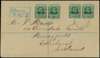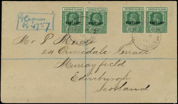 1919 envelope from Georgetown to Edinburgh bearing two pairs of ½d War Stamp with FE 4 CDSs (a first day cover), showing the rare abbreviated boxed ‘GCayman/R’ crayon registration mark, recorded only on this day with very few known. London transit on reverse. Very few recorded