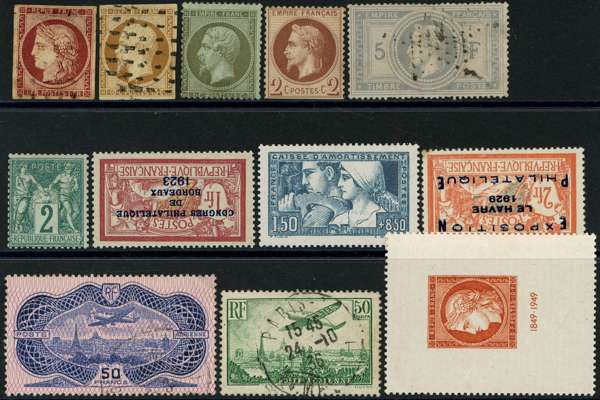 1849-1949 mint and used selection arranged on a stockcard including used 1949 1f, 1852-53 10c, 1969 5f, 1936 50f Air (both) and mint 1876 ‘N’ under ‘B’ 2c, 1928 ‘Sinking Fund’ 1f 50 + 8f 50. Condition mixed. (12)