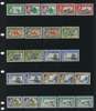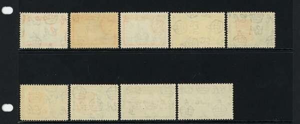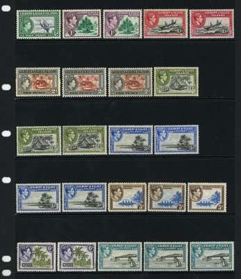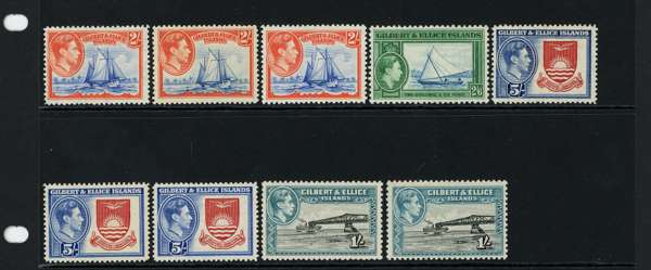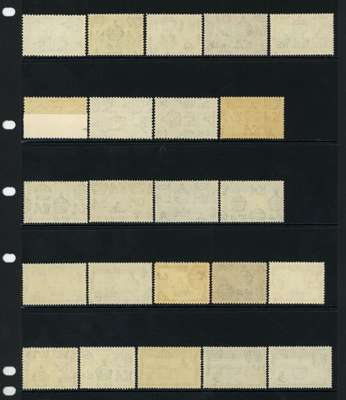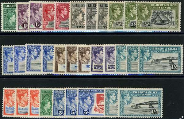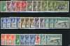 1939-55 set plus shades per SG and CW, unmounted o.g. Missing two simple stamps, the original ½d and the perf 12 3d, otherwise complete per CW including all three 5/-s and all five 1/-s (with the underrated 1952 perf 12 1/- greyish black and light turquoise-blue); 32 stamps, very difficult to assemble. SG 43-54