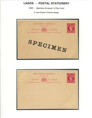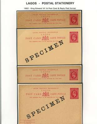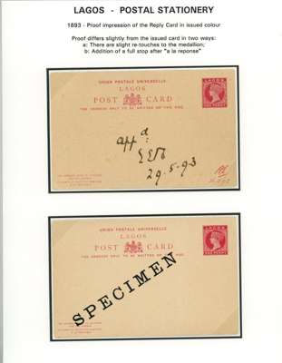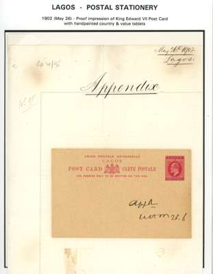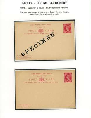 1887-1902 postal stationery postcard/reply paid card selection written-up on display leaves including 1902 (26 May) 1d carmine with hand-painted ‘LAGOS’ and ‘ONE PENNY’, approved, initialled and dated ‘26/6’ in manuscript, affixed to part of the Appendix sheet; also a range of different card types some overprinted ‘SPECIMEN’. A fine group. (19)