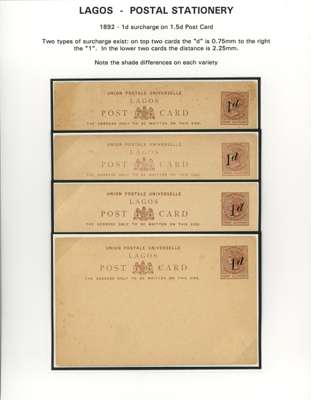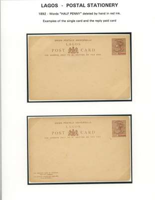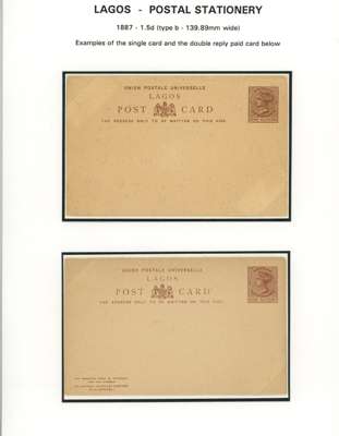 Lagos 1887-1902 postal stationery postcard/reply paid card selection written-up on display...