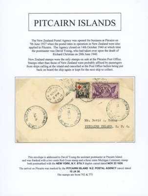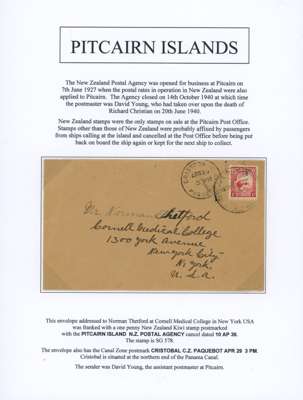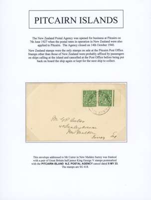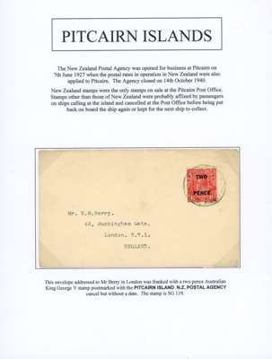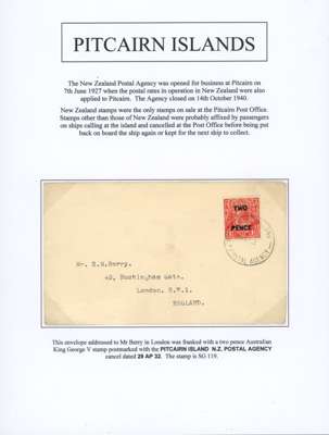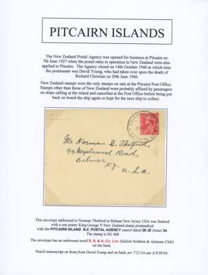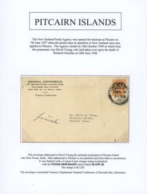1932-39 collection of eight covers, each cancelled by favour from Pitcairn Islands N.Z. Postal Agency cds, including: Australia KGV 2d on 1½d to England (2), GB ½d green to New Maldon, New Zealand KGV 1d to USA, incoming cover from USA to David Young, assistant Postmaster, incoming cover from India with 2a6p orange, tied by Poona New Bazar cds, generally fine condition.