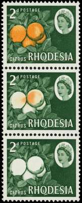 Rhodesia 1966 Harrisons printings vertical strip of three 2d with yellow-orange omitted and partial omission SG 375a...