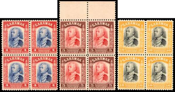 1934-41 $4, $5 and $10 in fresh unmounted o.g. blocks of four. SG 143-5, £720