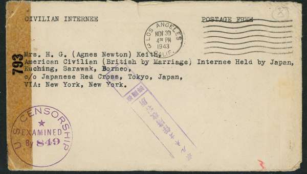 POSTAL HISTORY: Prisoner of War mail 1943 (30 Nov) postage free censored envelope from Los Angeles addressed to Mrs A N Keith, Internee Held by Japan, Kuching, Sarawak, Borneo, plastic tape seal ‘793’ tied with ‘U. S. CENSORSHIP/*/EXAMINED/By 849’ purple cachet, boxed Japanese kanji handstamp of Borneo alongside; small faults as to be expected otherwise fine. Scarce