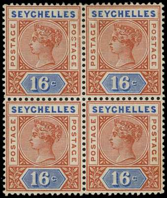 1892 16c Die II block of four, the upper left stamp with the R7/3 LP malformed ‘S’ variety, lightly hinged on the upper pair only; a scarce multiple. Vendor states this was the discovery example for this value. Brandon Certificate (1999). SG 14, a, £894