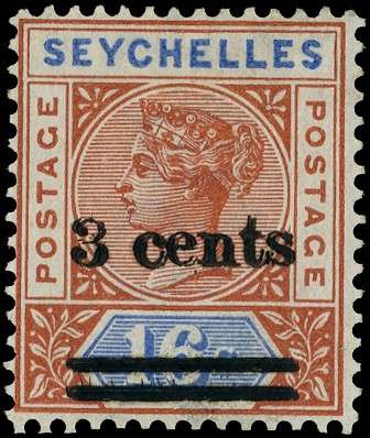 SEYCHELLES: 1901 3c on 16c chestnut and ultramarine, surcharge double, RPS certificate (2004) fine o.g. SG 38b...