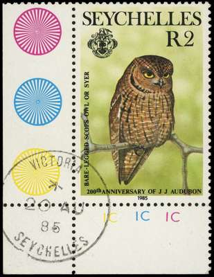 SEYCHELLES: 1985 2r Owl l/l corner marginal example watermark inverted error, fine used SG...