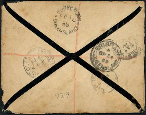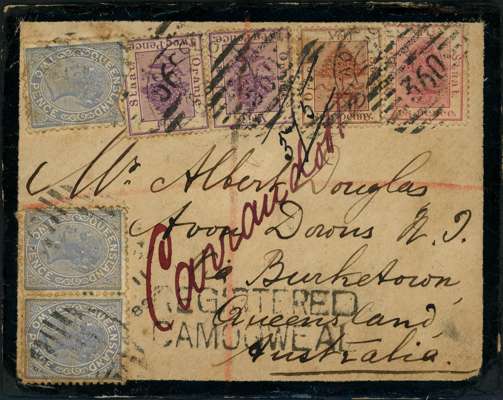 1889 registered mourning envelope to Burketown, Queensland franked with 1868-94 1d, 6d and 1883-84 2d, pair, all cancelled by ‘360’ numerals and Clocolan cds, forwarded and registered to Carrandott with ‘REGISTERED/CAMOOWEAL’ hs, franked with Queensland 2d pale blue (3) tied by barred numerals, the reverse with transit and arraval cancels; the cover has been repaired still a most unusual item