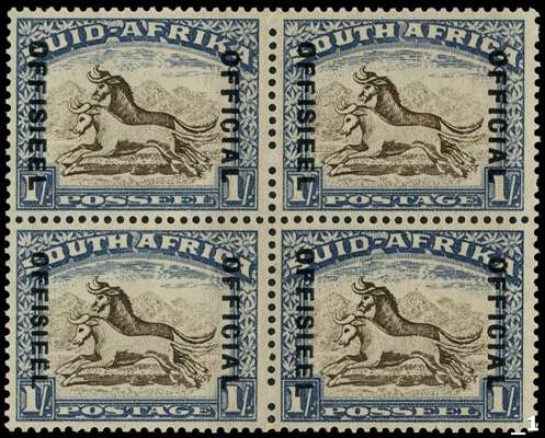 South Africa: 1935-49 1s brown and chalky blue, block of 4 with stamp 3 showing ‘Diaeresis over second “E” of “OFFICIEEL”...
