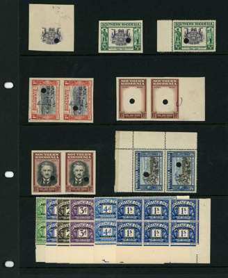 1940 BASC Golden Jubilee proofs with punch holes, singles of ½d central vignette, imperf and perforated, 1d imperf stamp, 1½d frame and imperf stamp, and 3d stamp in pairs, mixed condition, plus 1951 ½d to 1s postage due, l/r corner marginal blocks of 6 (3 x 2) unmounted o.g. SG 53/57var, D1/7
