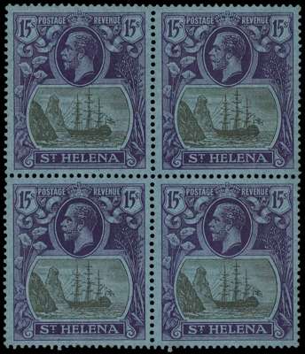 1922 15s grey and purple on blue, mint block of four, fresh and well centred, Brandon certificate (1993), fine o.g. SG 113 £4,400
