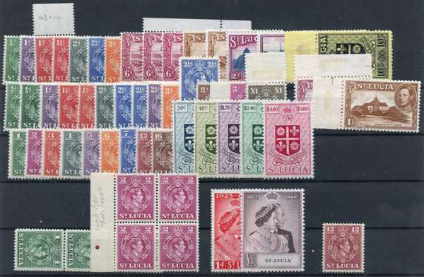 1938-48 set with all perfs and shades per SG and CW, and 1949-50 set plus 1c perf 14 coil strip of three, 2c perf 14 marginal block of four (ex sheet issue, scarce) and 12c perf 14½ x 14. All fresh unmounted o.g.; also Wedding pair unmounted o.g. SG 128-141, 144-59, £1050