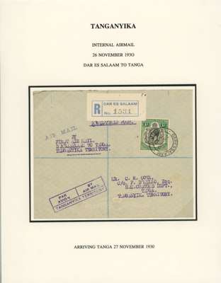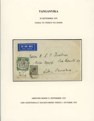 1930-32 three first flight envelopes all bearing 1927-31 1s black and green comprising 1930 (26 Nov) Daresalaam to Tanga, 1930 (2 Dec) Korogwe to Daresalaam and 1931 Mwangza to London'; also 1932 (21 Sep) envelope sent airmail to Venice franked with 1927-31 50c, 1s both tied with Tanga double-ring ds, backstamped Venice (1.10). A fine group. (4)