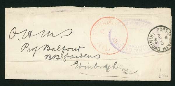 POSTAL HISTORY: 1895 Official Paid datestamp in red (29 AP 1895, Proud OPD12) on OHMS wrapper to Edinburgh, Scotland, from the Botanic Gardens, Trinidad with purple oval handstamp, Port of Spain cds (30 AP 1895), scarce