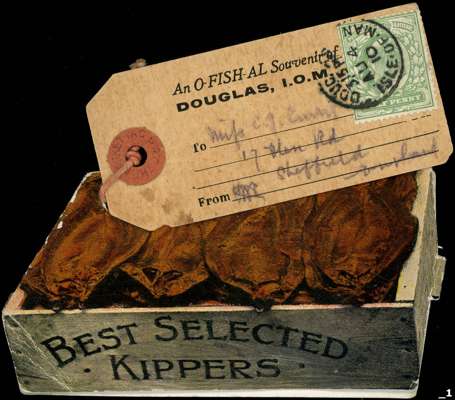 1910 parcel novelty postcard of crate of Kippers, franked by ½d yellowish green tied by Douglas Isle.of.Man cds for AU 4, with pull out views, attractive. SG 218