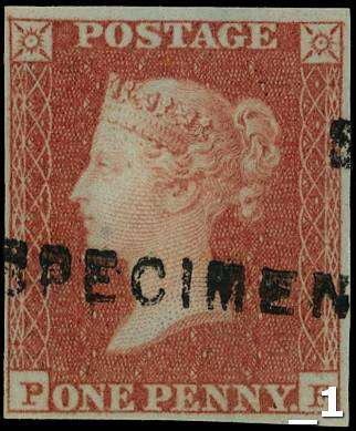 1841 1d red brown plate 90 (PF) four margin overprinted “SPECIMEN” type 1, large part o.g. SG 8var