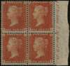1855 1d red brown Plate 9 (FK-GL right hand marginal block of four, showing part marginal inscription. brilliant large part o.g. Lovely colour and gum, scarce. SG 24