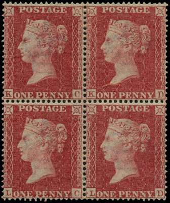 1857 1d rose-red Plate 37 (KC-LD) in block of four, provisional perf 16, brilliant o.g., quite exceptional for this issue. SG 36