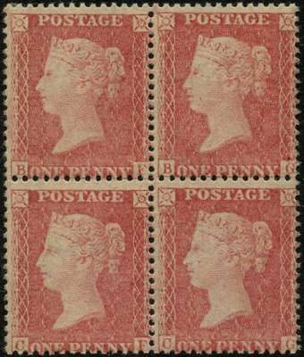 1863 1d pale rose-pink, shade, Plate 53 (BF-CG) in block of four, brilliant large part o.g., very fine and scarce. Ex. The Osboborne & Tonna block of 48, the only mint piece of this plate recorded. RPSL Certificate (1982)