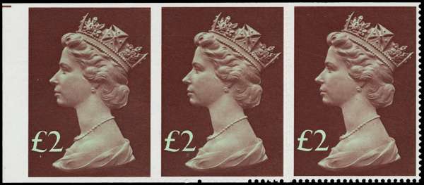 1977-87 £2 light-emerald and purple-brown, left marginal strip of three, partly perforated, imperforate at top, between stamp and margin and between first and second stamp. Fine unmounted mint. SG 1027 var