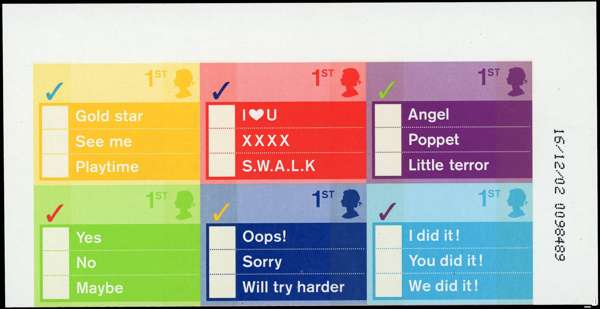 GB: 2003 (1st) Greetings Stamps. Occasions, imperforate error, upper right corner marginal block of 6, Pierron reports