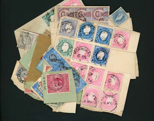 All World late 19th Century to 1920s assortment either on paper or soaked off from incoming mail and affixed to piece, with strength in India including, 1882-1900 issues mostly telegraphically used, Telegraph 1890-91 issue used half's to 50r, Indian States, with Patiala State 1891-1902 range to 1r with later ½a and 1a and 1a fiscal, affixed to letterhead from ‘United Service Club, Simla’ Cochin, Travancore and Sirmoor, Portuguese India and Netherlands India oddems, Great Britain parcel labels bearing 2/6d and 5/- Seahorses with Jersey cds's, mixed condition, still very interesting lot.