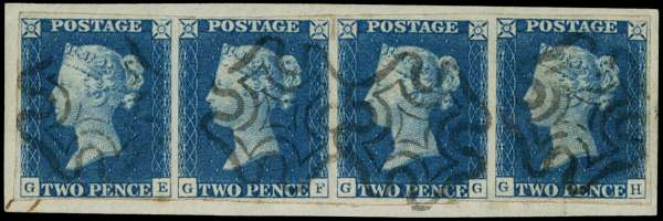 1840 2d blue, plate 1 (GE-GH). horizontal strip of four with close to large margins, neatly tied to small by crisply struck with black Scottish thin lined Maltese Crosses; light vertical filing fold effecting GH. A scarce multiple and most attractive. SG 5; Spec. DS5.