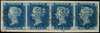 1840 2d blue, plate 1 (GE-GH). horizontal strip of four