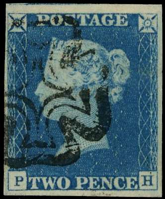 1840 2d blue, plate 1 (PH), good to large margins, neatly cancelled by fine strike of the distinctive black Manchester “Fishtail“ Maltese Cross. Fine and attractive. SG 5