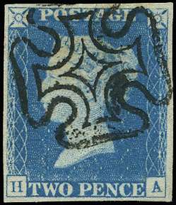 1840 2d Pale-blue Pl.1. Superb used four margin example lettered HA, neatly cancelled by a crisp black distinctive Greenock MC. Spec. DS6va.