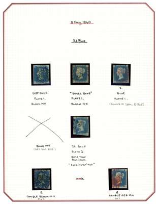 1840 2d blue plated range of six, up to four margins, cancelled either by red or black MC, bar one example struck by part town postmark for Fordingbridge, mixed condition, mostly fine appearance. SG 5 (6)